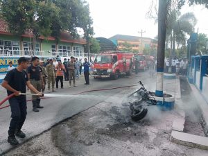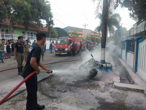 Kronologi Pemilik motor sedang menjemput anaknya waktu mau pulang tiba – tiba terlihat api menyambar bagian tengah mengenai jok motor sehingga api membesar.